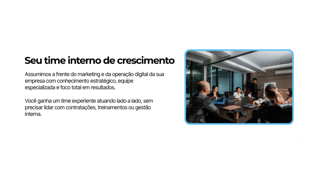 Você ganha um time experiente atuando lado a lado, sem precisar lidar com contratações, treinamentos ou gestão interna.