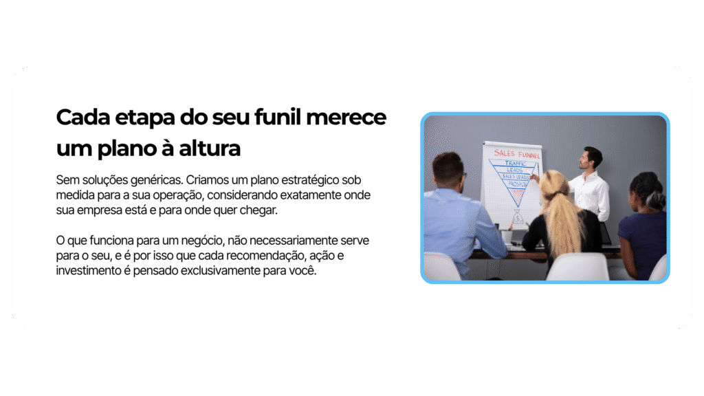 O que funciona para um negócio, não necessariamente serve para o seu, e é por isso que cada recomendação, ação e investimento é pensado exclusivamente para você.